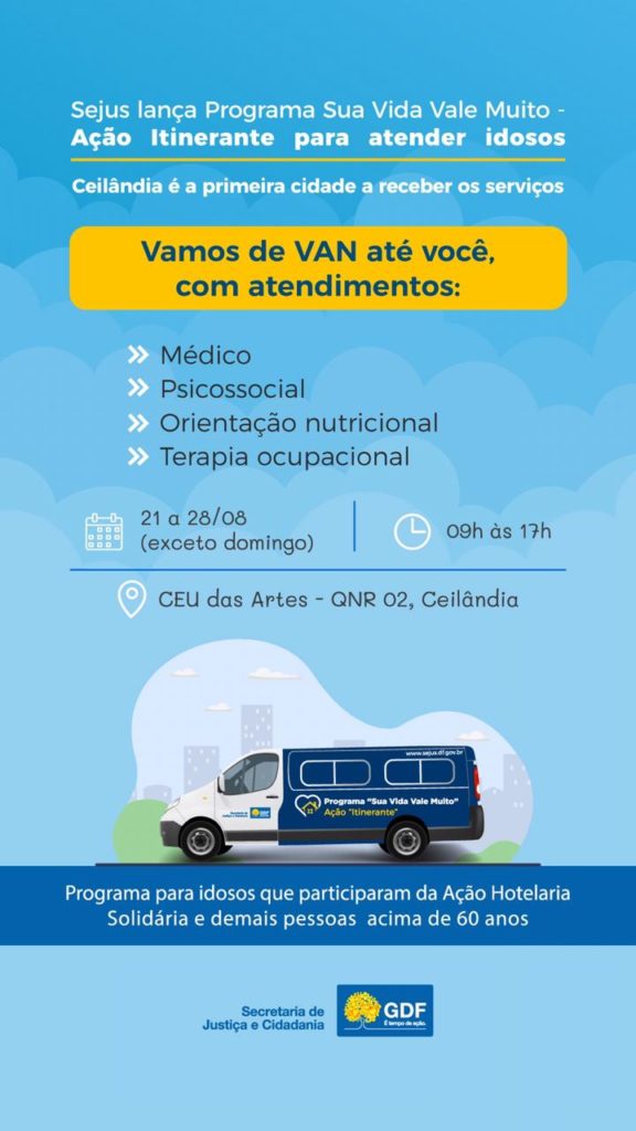 A Secretaria de Justiça e Cidadania (Sejus) começa, nesta sexta-feira (21), uma nova fase do Programa Sua Vida Vale Muito: a Ação Itinerante. A proposta é visitar as cidades do Distrito Federal para levar atendimento médico, psicossocial, orientação nutricional e terapia ocupacional aos idosos, especialmente os que participaram da ação Hotelaria Solidária. A Ceilândia será a primeira cidade a receber o serviço, que estará no CEU das Artes – QNR 02, entre os dias 21 e 28 de agosto (exceto no domingo), das 09h às 17h.