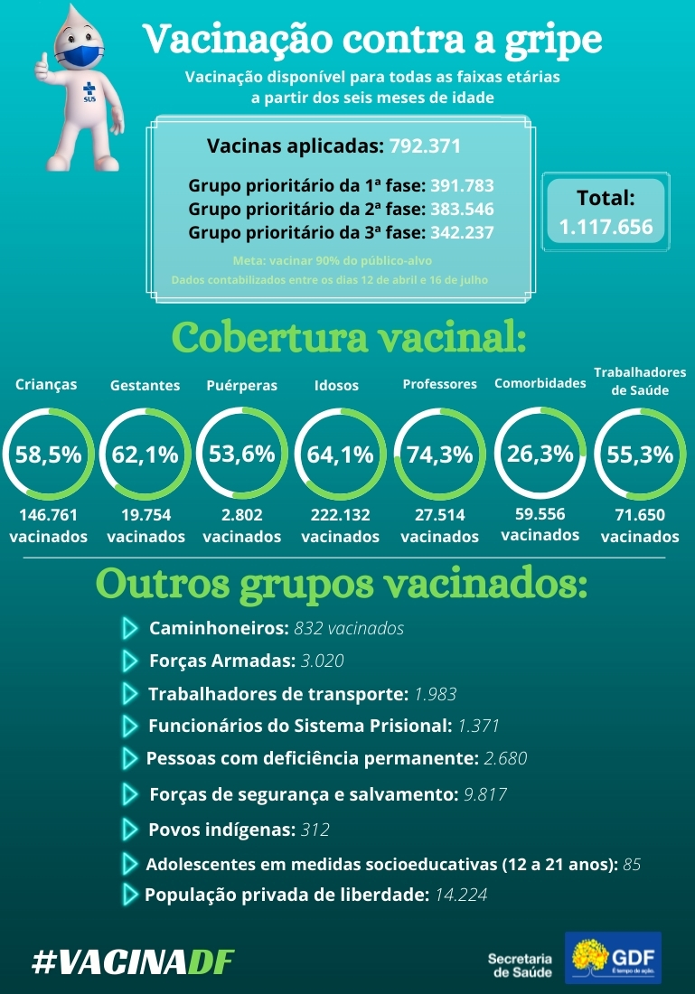 Cerca de 800 mil pessoas foram vacinadas no DF desde o dia 12 de abril, o que resultou em baixa procura pelos grupos prioritários. A cobertura vacinal tem sido maior para os professores, que já tem 74,3% do público estimado vacinado. A cobertura em idosos é de 64,1% e gestantes em 62,1%.